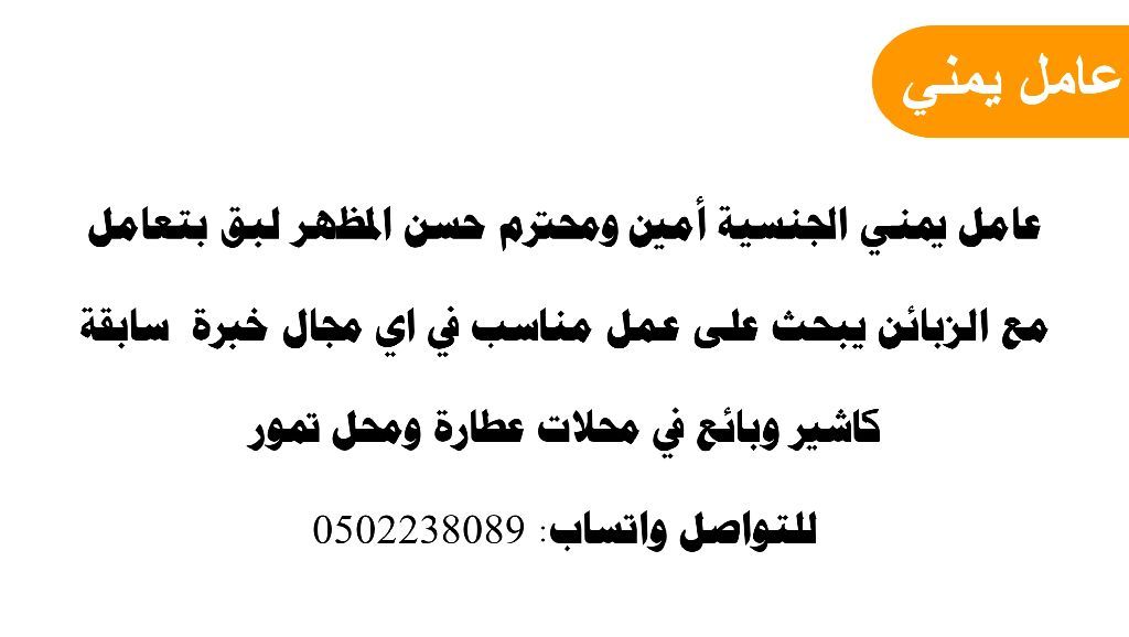 عامل يمني الجنسية أمين ومحترم حسن المظهر لبق بتعامل مع الزبائن يبحث على عمل مناسب في أي مجال خبرة سابقة كاشير وبائع في محلات عطارة ومحل تمور