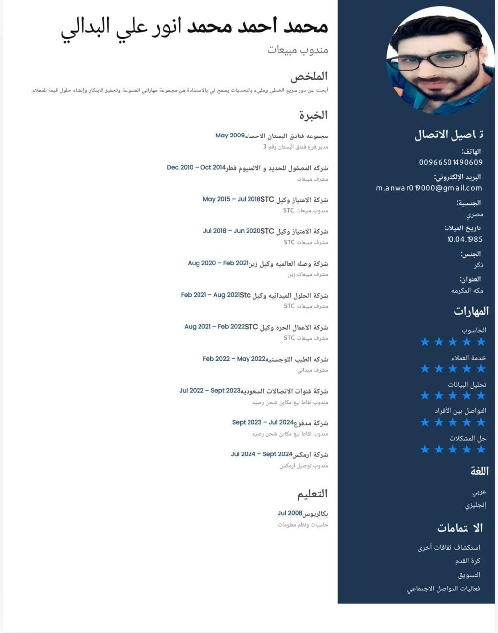 باحث عن عمل في مجال المبيعات خبرة أكثر من 10 سنين في أغلب مناطق المملكة