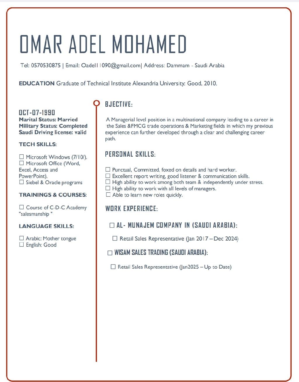 ابحث عن فرصة عمل في مجال المبيعات والتوزيع المباشر العمل لدى شركة المنجم الأغذية 8 سنوات والعمل الحالي شركة وسام البيع للمواد الغذائية وجود قاعدة عملاء في الدمام وعملاء المخفض أجيد التواصل مع العملاء، بناء العلاقات، وتحويل الفرص الى نتائج ملموسة. متاح للانضمام فورا لأي فريق عمل طموح يسعى للنجاح