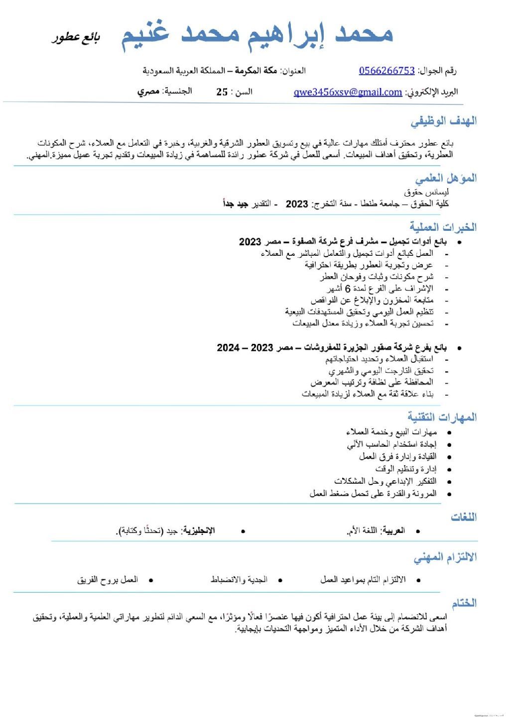 ابحث عن فرصة عمل في مجال بيع العطور، مستحضرات التجميل، أو المفروشات لدي خبرة سنة وأشهر في مجال المبيعات وخدمة العملاء أجيد شرح المنتجات، اقناع العميل، والترتيب والعرض داخل المحل ملتزم بالدوام والعمل بروح الفريق وأتحمل ضغط العمل العمر 25 سنة متواجد حاليا في المدينة المنورة وجاهز للعمل فورا للتواصل اتصال