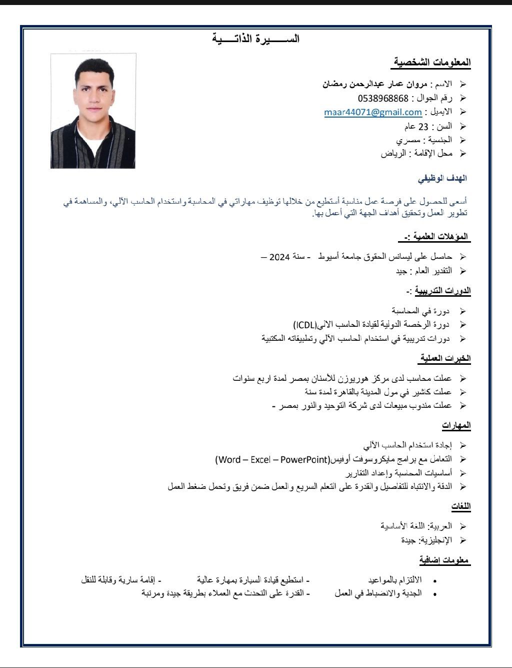 مقيم من الجنسية المصرية في مدينة الرياض حاصل على مؤهل عالي وأجيد قيادة السيارة وأجيد التعامل على الكمبيوتر وبرامج الأوفيس الأكسيل والوورد ابحث عن وظيفة مبيعات أو مندوب مبيعات ولدي اقامة سارية لمدة عام