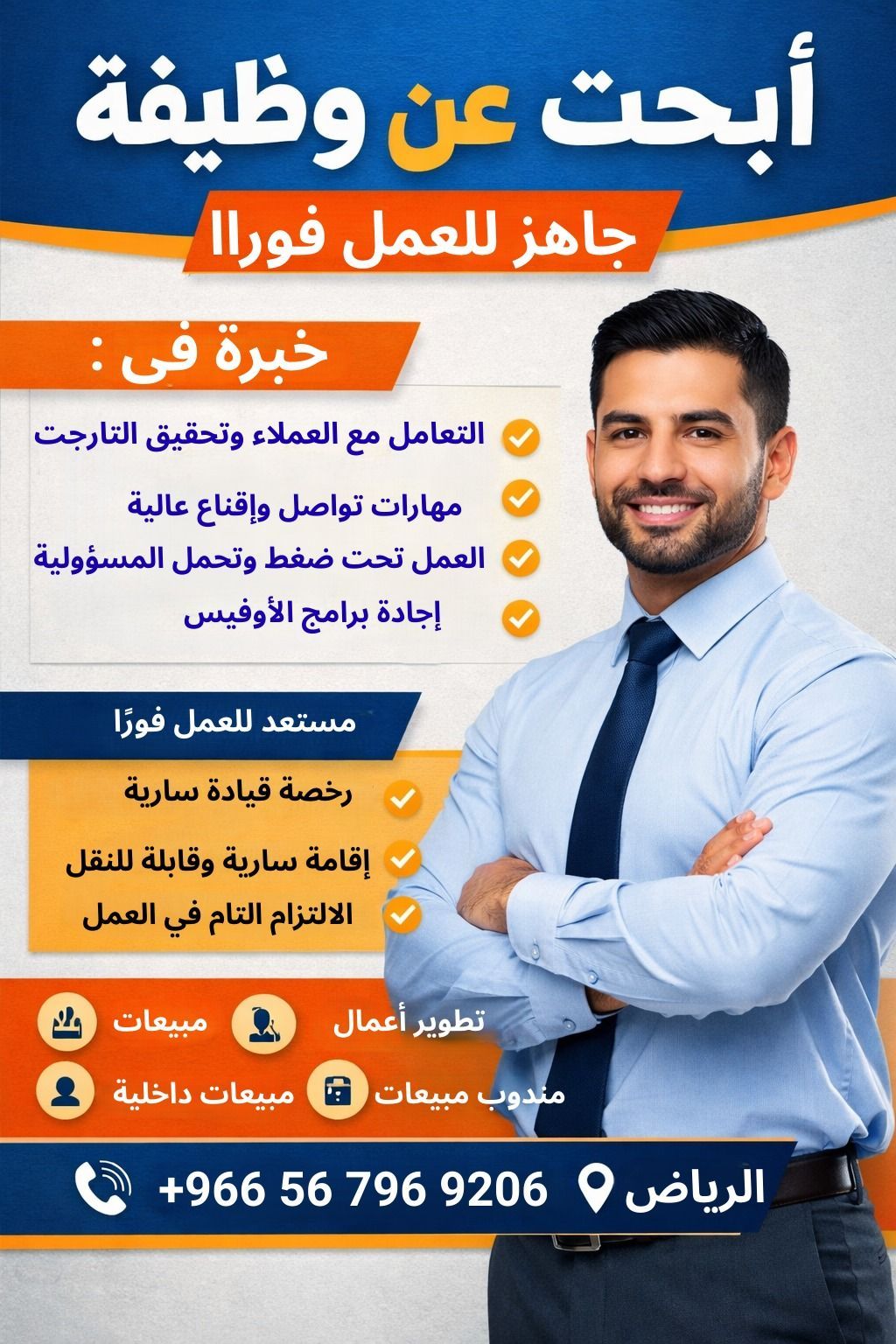 مندوب مبيعات - أخصائي مبيعات - تطوير أعمال - مبيعات داخلية) مقيم في الرياض، ابحث عن فرصة ضمن شركة طموحة ترغب في زيادة حصتها السوقية وتعزيز نموها. أنا لا ابحث عن وظيفة فقط بل ابحث عن بيئة أستطيع فيها تحقيق نتائج واضحة ومضاعفة المبيعات من خلال بناء علاقات قوية مع العملاء وتحويلهم الى عملاء دائمين مهارات تفاوض واقناع فعالة تؤدي لاغلاق الصفقات الالتزام بتحقيق التارجت والعمل بخطة واضحة تحمل ضغط العمل