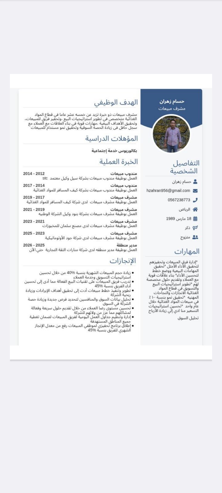 مشرف مبيعات خبرة 7 سنوات بالمملكة وخبرة في الرياض والدمام والخرج والقصيم والمدينة