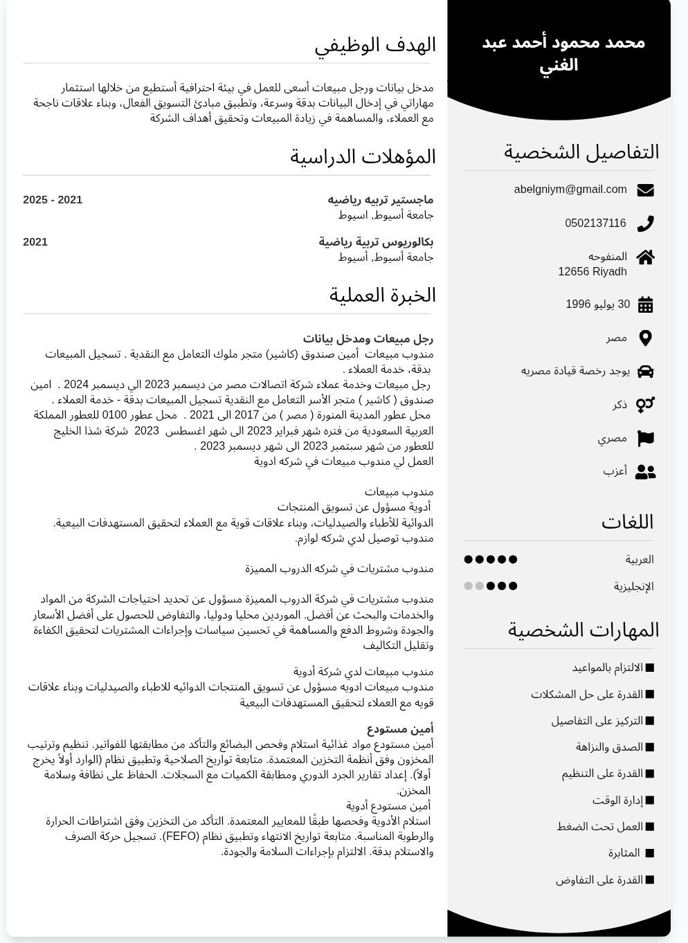 مدخل بيانات ورجل مبيعات أسعى للعمل في بيئة احترافية أستطيع من خلالها استثمار مهاراتي في ادخال البيانات بدقة وسرعة، وتطبيق مبادئ التسويق الفعال وبناء علاقات ناجحة مع العملاء، والمساهمة في زيادة المبيعات وتحقيق أهداف الشركة أجيد التعامل برامج الورد والأكسيل ولدي خبرة في أمين مستودع وخبرة التعامل مع النقدية وتسجيل المبيعات بدقة خدمة العملاء
