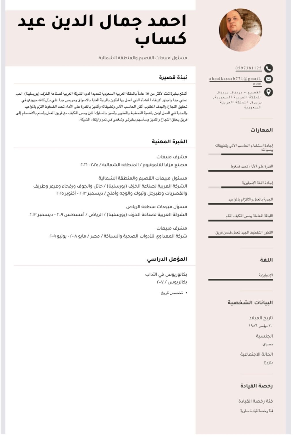 ابحث عن عمل كمدير مبيعات أو مشرف مبيعات لدي خبرة أكثر من 17 عام داخل المملكة في الأدوات الصحية في القصيم والمنطقة الشمالية لدي القدرة علي قيادة فريق كامل وتنظيم وتطوير الأداء الوظيفي للحصول علي أعلى النتائج في المبيعات والتحصيل