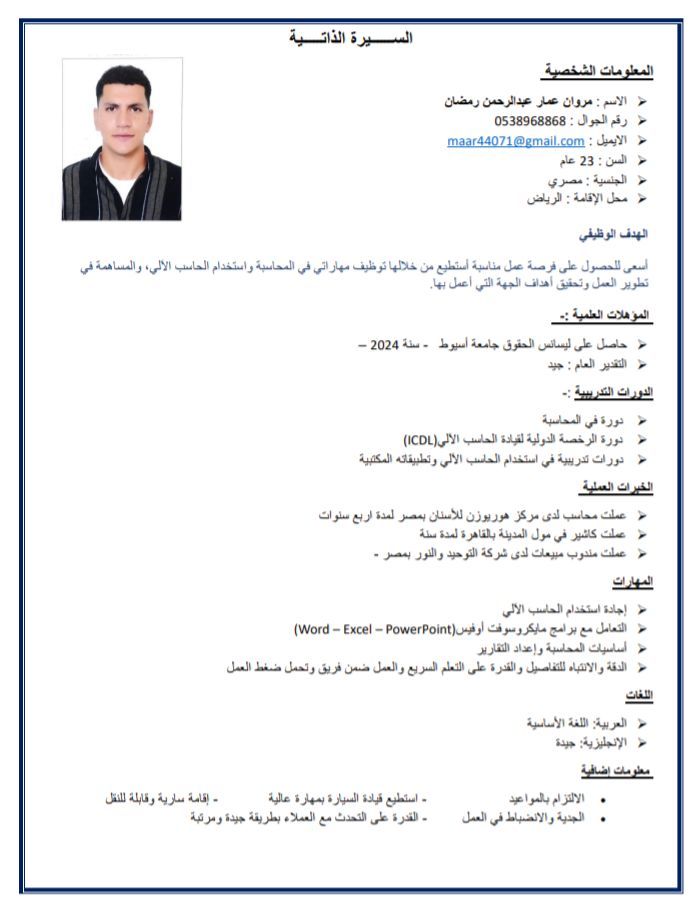 مصري مقيم في الرياض السن 23 عام. حاصل على مؤهل عالي. حاصل على دورات تدريبية في الكمبيوتر وبرامج الأوفيس الوورد والأكسيل والبوربوينت معي إقامة سارية ومعي رخصة سارية ابحث عن وظيفة مبيعات (سيلز) أو مندوب مبيعات في الرياض خاصة أو في المملكة عموما. على علم بالطرق في الرياض قد عملت مدير مبيعات لمركز لتركيب الأسنان في مصر