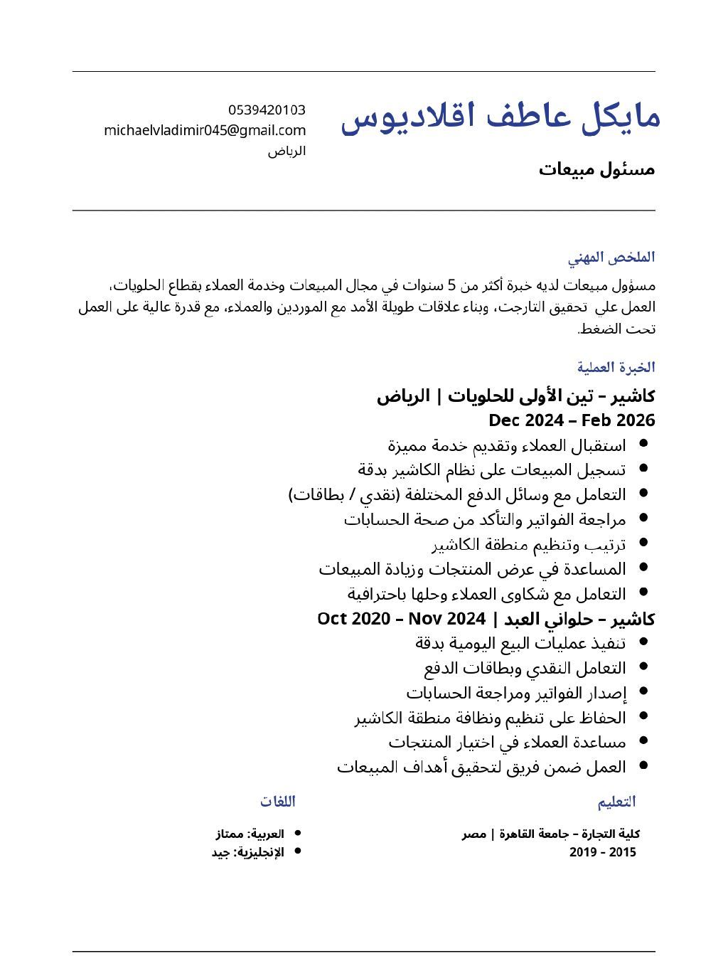مسؤول مبيعات لدي خبرة 5 سنوات في مجال المبيعات والكاشير