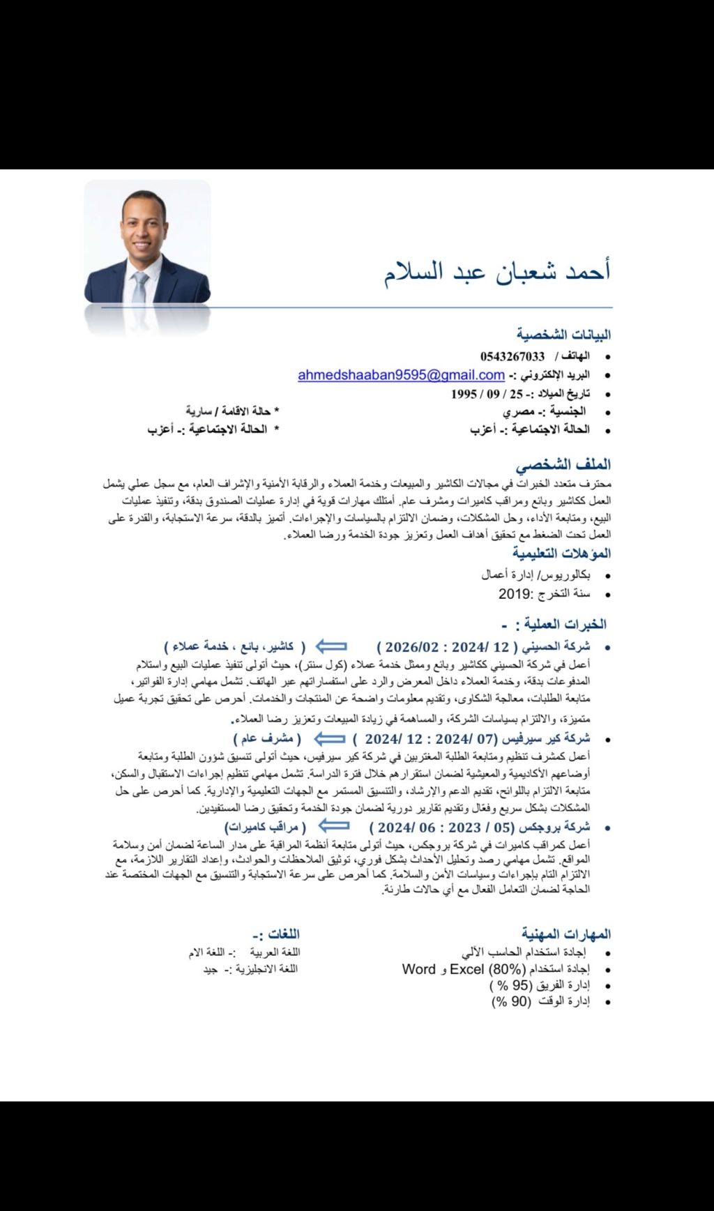 محترف متعدد الخبرات في مجالات الكاشير والمبيعات وخدمة العملاء والرقابة الأمنية والاشراف العام، مع سجل عملي يشمل العمل ككاشير وبائع ومراقب كاميرات ومشرف عام. امتلك مهارات قوية في إدارة عمليات الصندوق بدقة، وتنفيذ عمليات البيع، ومتابعة الأداء، وحل المشكلات، وضمان الالتزام بالسياسات والاجراءات. أتميز بالدقة، سرعة الاستجابة، والقدرة على العمل تحت الضغط