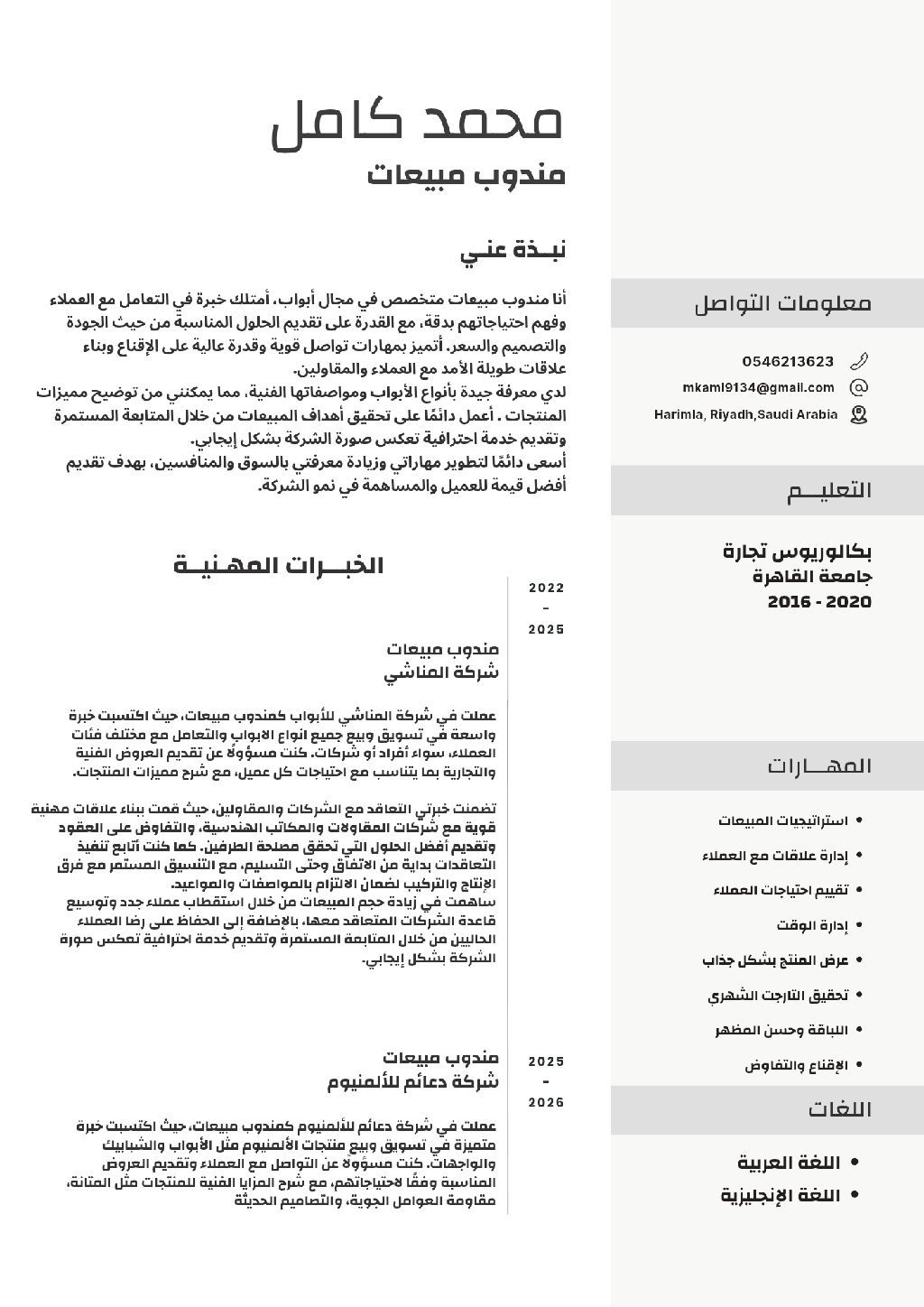 مندوب مبيعات في مجال الأبواب يطلب عمل أنا مندوب مبيعات لدي خبرة في مجال بيع الأبواب (حديد - خشب - ألومينيوم) ابحث عن فرصة عمل مناسبة داخل شركة تعمل في نفس المجال. امتلك خبرة في التعامل مع العملاء، وفهم احتياجاتهم، وتقديم الحلول المناسبة لهم، مع القدرة على تحقيق أهداف المبيعات وبناء علاقات قوية مع العملاء. لدي معرفة جيدة بأنواع الأبواب ومواصفاتها الفنية، مما يساعدني على اقناع العميل واختيار المنتج