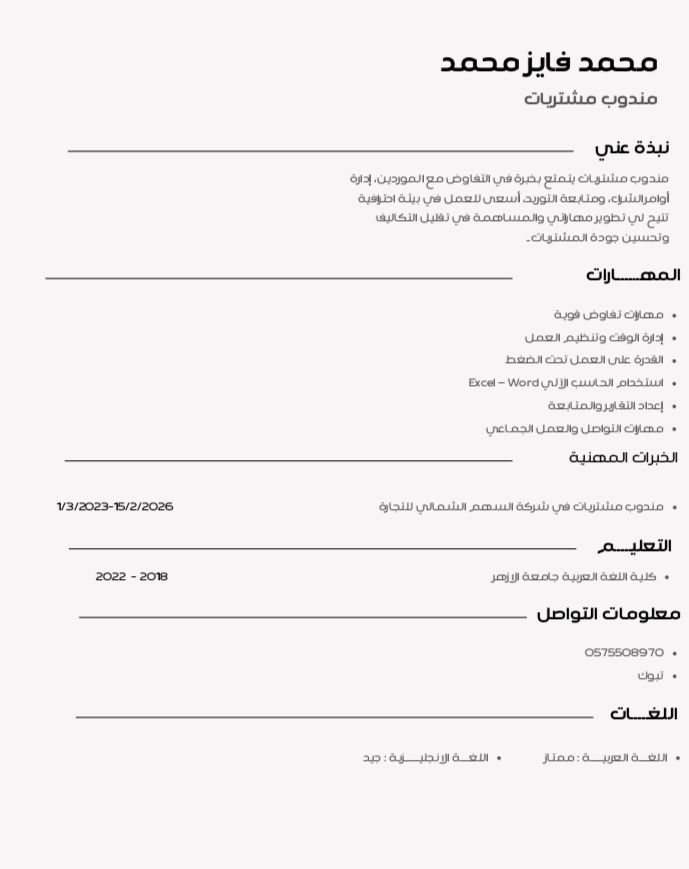 مندوب مشتريات بخبرة 3 سنوات في مجال المقاولات، متخصص في تأمين المواد بأفضل الأسعار وبجودة عالية، مع معرفة قوية بالسوق والموردين