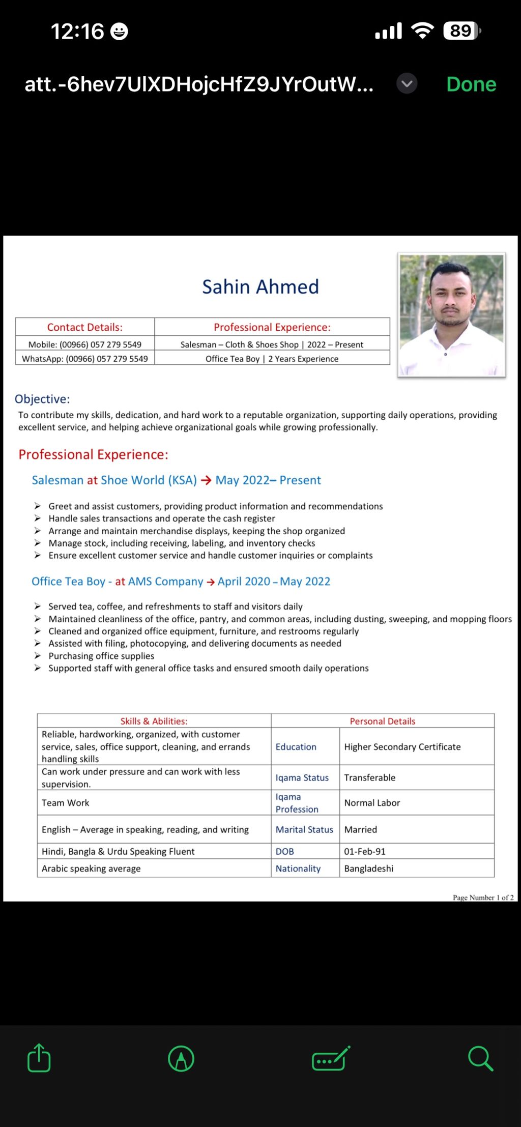I am Sahin Ahmed. my Experience Salesman cloth & shoes shop Marketing this Running I will be need tranfer. have another Experience office tea boy 2 years. language Arabic, English, Hindd. now available for transfer Iqama. if you need please contact me
