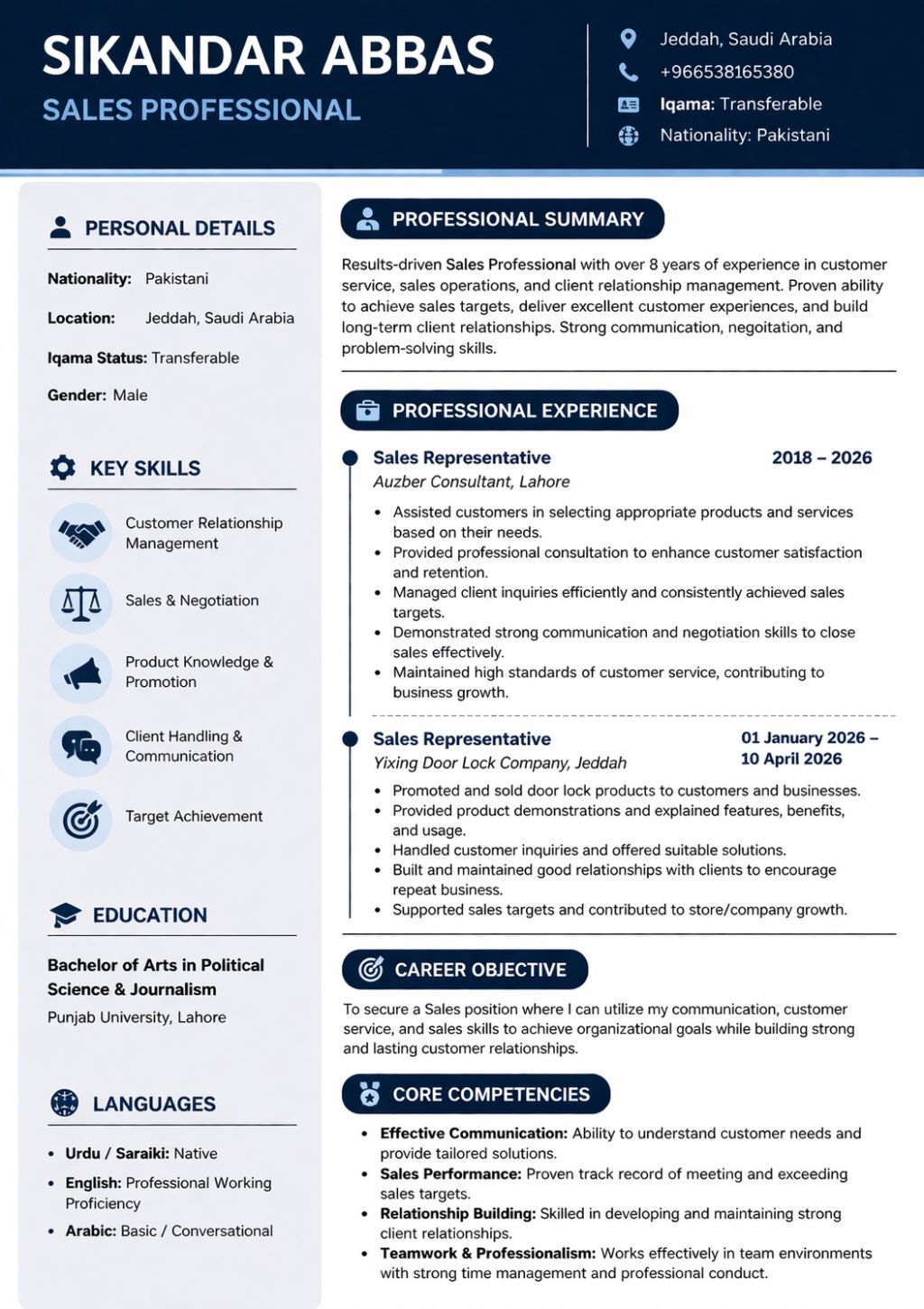 ساعدت العملاء، وحققت أهداف المبيعات، وتعاملت مع المعاملات المالية، وحافظت على عرض المنتجات بشكل منظم