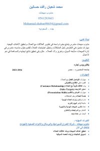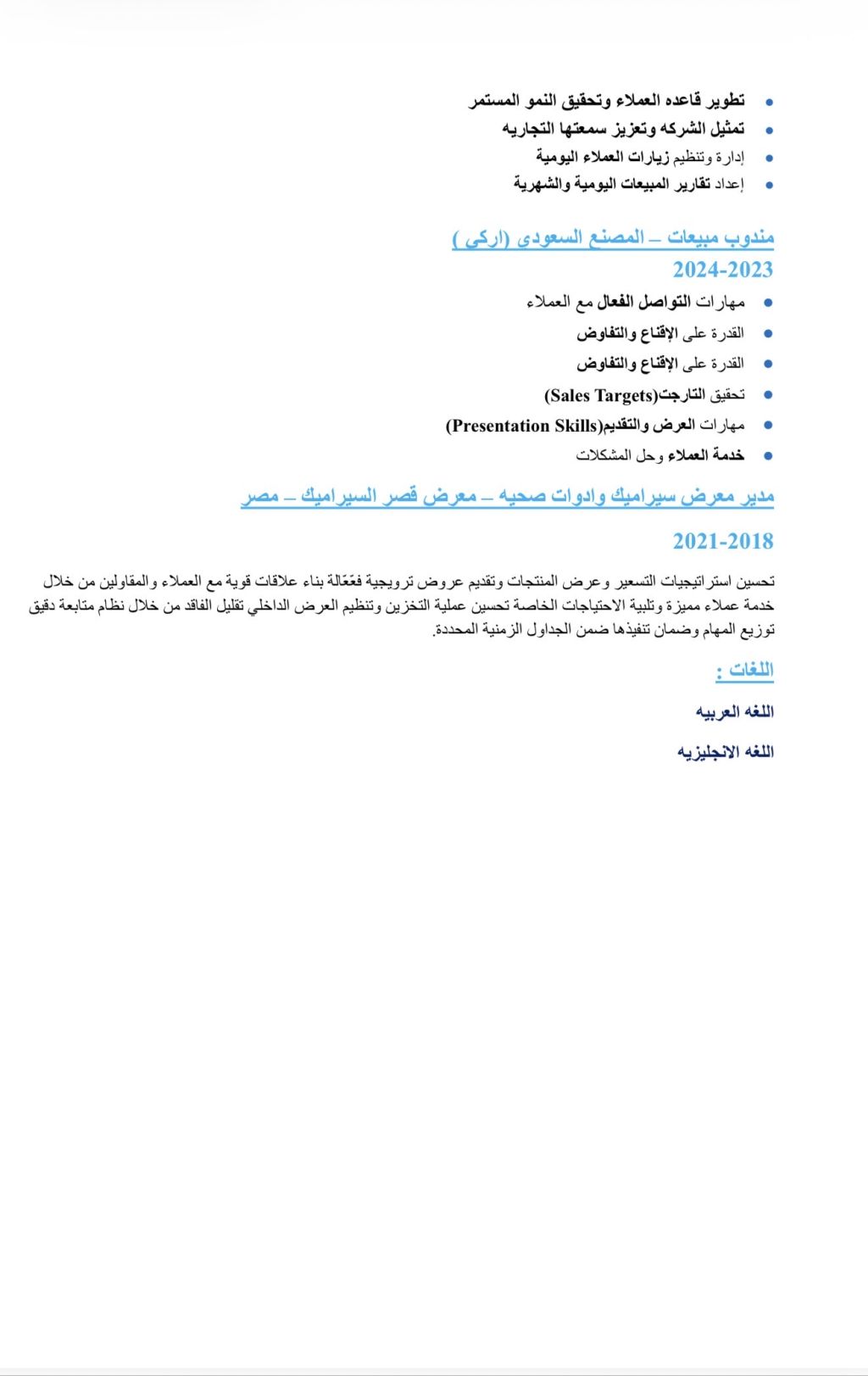ابحث عن فرصة عمل - مندوب مبيعات وتسويق محمد شعبان، مندوب مبيعات بخبرة في السوق السعودي في مجال السيراميك والأدوات الصحية. لدي مهارات قوية في التفاوض، تحقيق التارجت، وبناء علاقات العملاء. خبرة في إدارة الزيارات، متابعة الطلبات، واعداد تقارير المبيعات