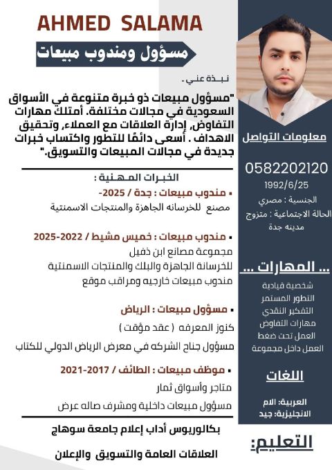 خبرة في مجال المبيعات (مندوب مبيعات خارجي - موظف مبيعات داخلي) بالمملكة أكثر من 9 سنوات منها 5 سنوات في مجال الخرسانة والبلوك والمقاولات بالمنطقة الجنوبية مقيم حاليا بمدينة جدة ولا مانع من الانتقال الى مدينة أخرى إقامة مهنية ورخصة القيادة متوفرة