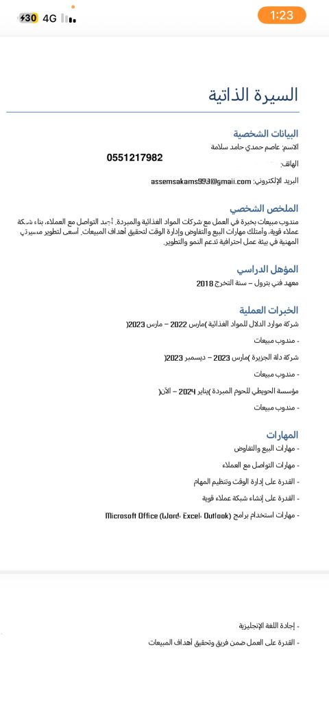 الاسم/ محمد عبد الرحيم. الجنسية / يمني. الإقامة / سارية. يوجد رخصة قيادة التعليم بكالوريوس صيدلة. الخبرة في مجال التسويق شركة شفاكو. المهم نزول ميداني في السوق أبرز أهمية المنتج واقنع العملاء بأخذ المنتج. شرح مواصفات المنتج بسلوب مقنع