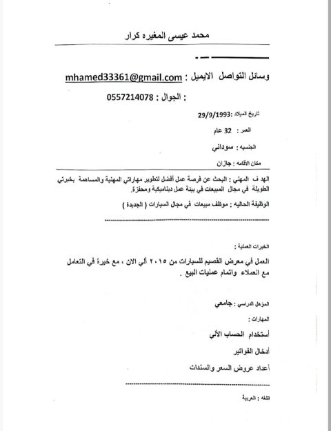 الاسم محمد حزام الجنسية اليمن العمر 45 سنة خبرة في مجال المبيعات فترة تجاوزت 15 سنة منها 10 سنوات في السوق السعودي عملت سابقا مسؤول فرع فوق 5 سنوات في مجال الانارة (LED) ادخال الفواتير ووضع الأسعار وتكويد الأصناف في النظام وبيع مباشر مع الجمهور ومجالات وأنشطة أخرى في المبيعات عملت أيضا في مجال المشتريات اشراف مباشر على عمليات الشراء والمتابعة أيضا عملت مساعد مدير ومشرف في مجال أنشطة المطاعم اشراف كامل