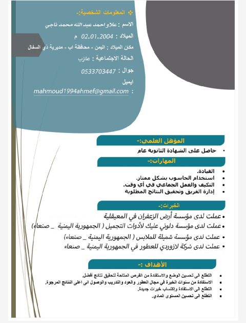 امتلك خبرة ثلاثه سنين في مجال المبيعات وادارة الفروع والمستودعات داخل المملكة وادخال البيانات وعملت لمدة سنة محاسب المؤهل التعليمي بكالوريوس إدارة أعمال، إقامة قابلة للنقل)