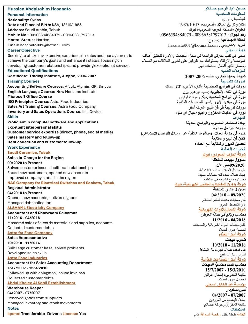 مندوب مبيعات خبرة في مجال مواد كهربائية والصحي والسيراميك في تبوك والمنطقة الشمالية وليس مانع في العمل في أي مكان ومتواجد حاليا في الدمام