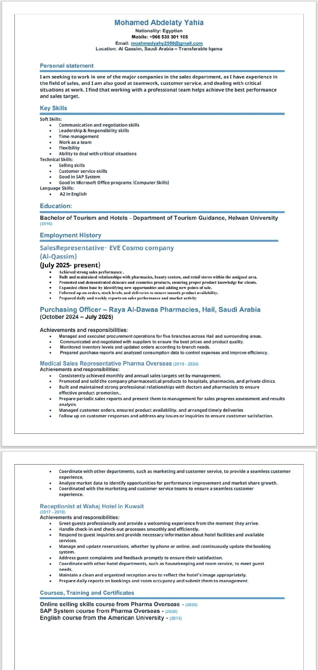 أسعى للعمل في احدى الشركات الكبرى بقسم المبيعات، حيث أتمتع بخبرة في مجال المبيعات، وأجيد العمل الجماعي وخدمة العملاء والتعامل مع المواقف الحرجة في العمل. أجد أن العمل مع فريق عمل محترف يساعد على تحقيق أفضل أداء وأعلى نسبة مبيعات