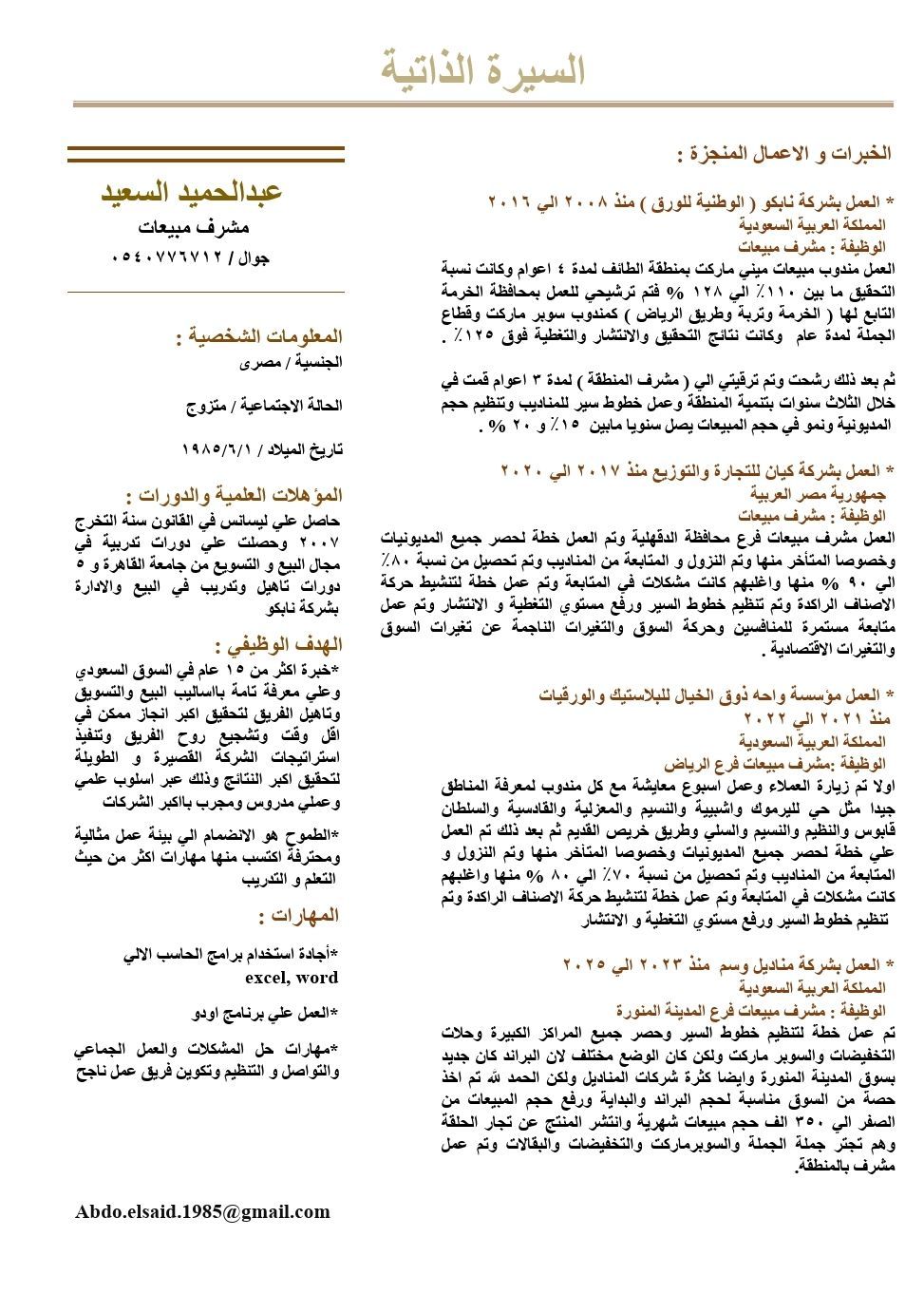 Egyptian sales supervisor with more than 15 years of experience in the Kingdom of Saudi Arabia. I worked for the largest companies and brands in the Kingdom. I have a university degree and training courses from the largest companies and at the highest level of professionalism. I want to join an ambitious work environment