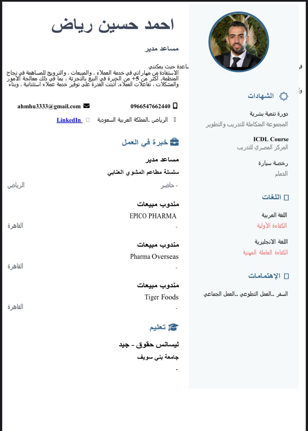 ابحث عن وظيفة مدير مطعم، مدير فرع أو مندوب مبيعات. لدي خبرة تزيد عن 4 سنوات في مجال إدارة المطاعم والمبيعات، حيث عملت ك سوبر فايزر لمدة 3 سنوات كمدير مطعم في الرياض وعملت كمندوب مبيعات في قطاع المواد الغذائية لمدة عام