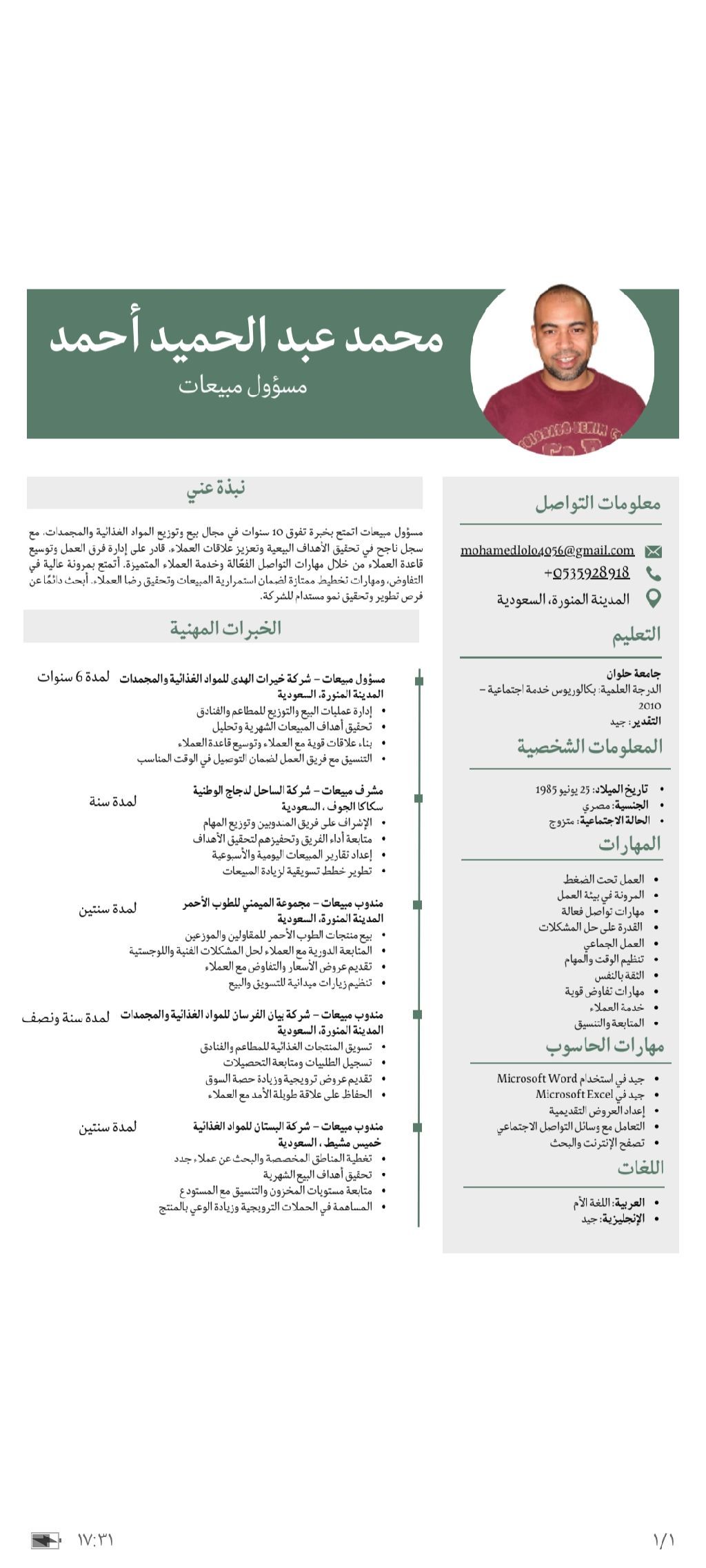 مسؤول مبيعات ومشرف مواد غذائية ومجمدات لتوريدات الفنادق الإعاشات والجملة خبرة 10 سنين