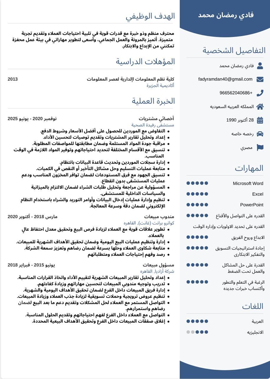 الاسم فادى رمضان محمد السن 29 سنة مقيم في الرياض ابحث عن فرصة عمل في مجال المبيعات والمشتريات والحسابات