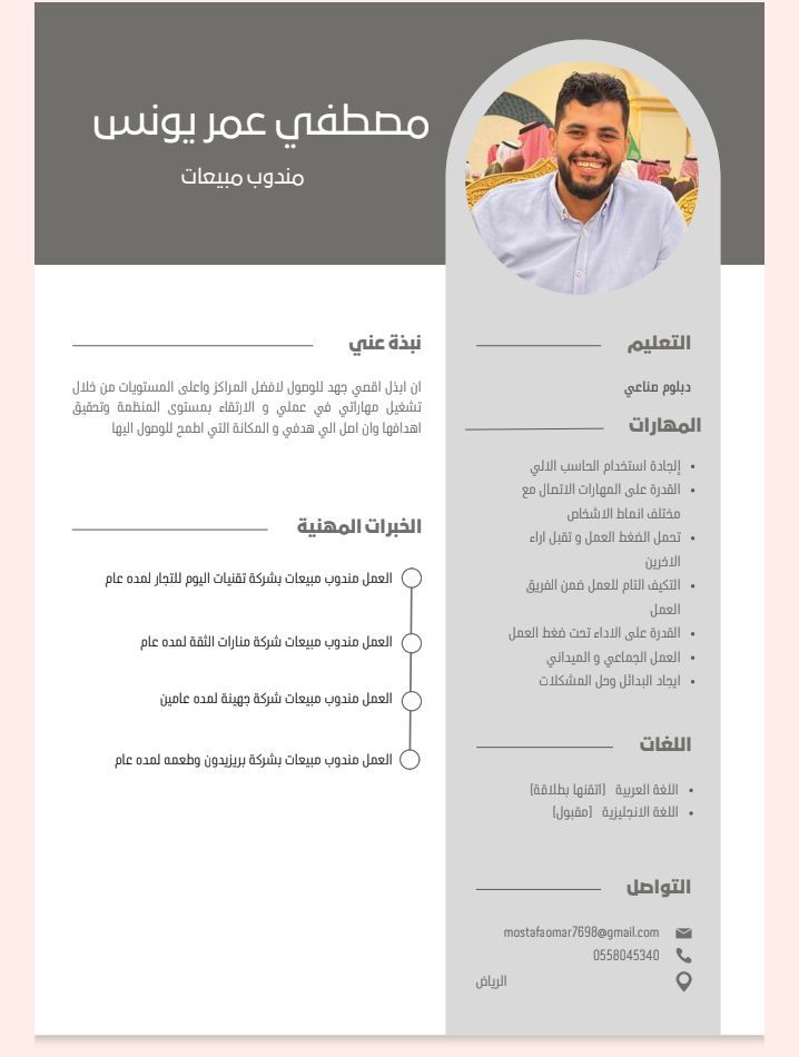ابحث عن عمل أنا مندوب مبيعات خبرة في المجال منذ عام 2019 وخبرة داخل المملكة منذ عام 2022 السن 27 سنة متزوج لدي خبرة في الرياض اشتغلت مواد غذائية واشتغلت في مجال الأوراق الحراري أجيد قيادة سيارة دينا وعلي دراية كاملة بأحياء منطقة الرياض أسواق ومطاعم وتموينات أحمل رخصة قيادة خصوصي ولا مانع من الشغل في أي مكان في المملكة برجاء من لديه فرصة عمل لي التواصل معي على الرقم