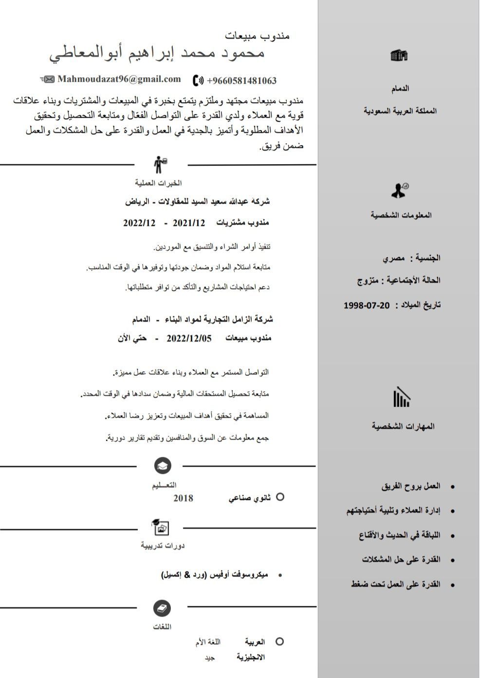 طلب وظيفة - مندوب مبيعات اعمل حاليا مندوب مبيعات في شركة الزامل التجارية لمواد البناء والسلامة، ولدي خبرة في المبيعات وبناء علاقات قوية مع العملاء، والمتابعة المستمرة لتحقيق الأهداف البيعية. أتميز بالقدرة على الاقناع والتفاوض، والتعامل مع العملاء باحترافية، والعمل تحت الضغط بروح الفريق. ابحث عن فرصة عمل في مجال المبيعات أو تطوير الأعمال أساهم فيها بخبرتي ومهاراتي لتحقيق نمو مبيعات الشركة
