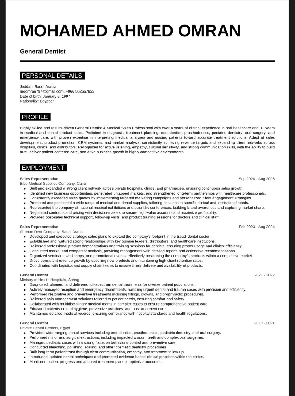 I am Mohamed Omran, a general dentist, looking for a job in the field of selling and marketing dental supplies and equipment. This is my CV and contact