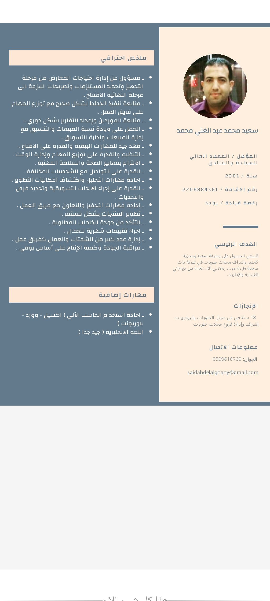 ابحث عن عمل في مجال الحلويات خبرة في المبيعات والتسويق وإدارة وتطوير فريق عمل معارض حلويات وخبرة في تنسيق البوفيهات المفتوحة وخبرة في التعامل مع العملاء بصدر رحب وانجاز المهام الموكلة أليي من الإدارة'يوجد رخصة سياقة سارية المفعول ويوجد إقامة سارية شهرين ويوجد CV والله ولي التوفيق