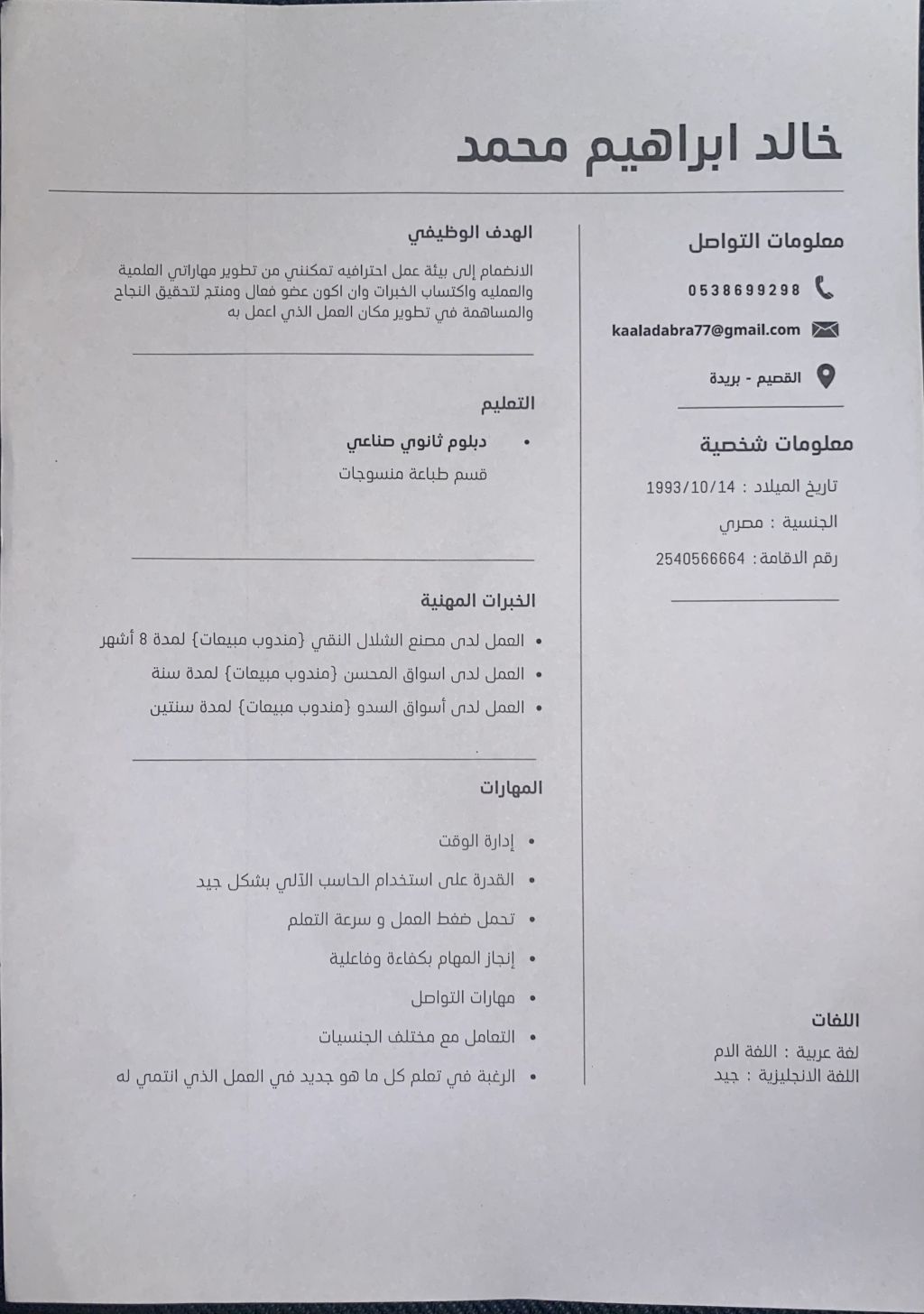ابحث عن فرصة عمل مندوب مبيعات خبرة في المجال سنتين يوجد قاعدة عملاء في بريدة