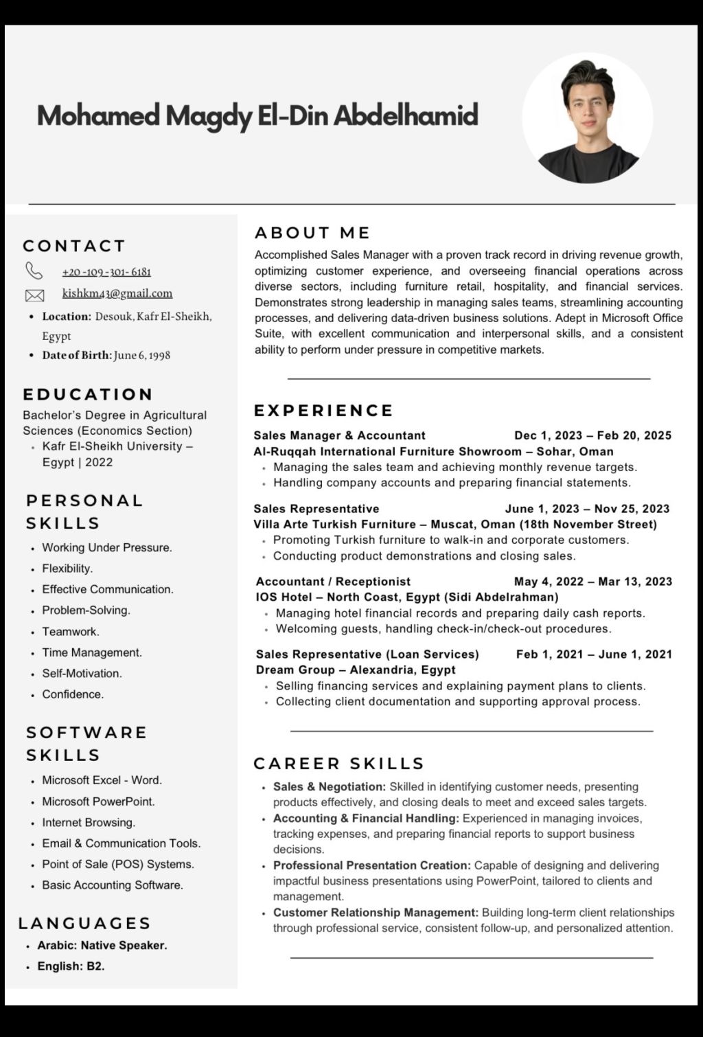 Branch manager for furniture in Sohar city, Sultanate of Oman, and I have experience in accounts and human resources. I worked in Al - Raqqa International Furniture Company in the Sultanate of Oman - HR in Villa Art Company for Turkish Furniture. University Qualification Bachelor of Agricultural Sciences - I am in Riyadh city now