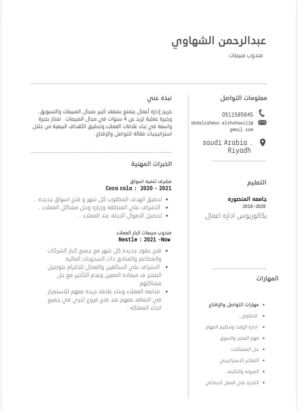 باحث عن وظيفة مندوب مبيعات، عملت 4 سنين في المملكة في شركة Nestle، أتميز بخبرة في التواصل الفعال مع العملاء، وفهم احتياجاتهم لتقديم أفضل الحلول والخدمات، القدرة علي تحقيق الأهداف البيعية، وبناء علاقات قوية وطويله الامد مع العملاء. اسعي دائما لتطوير مهاراتي والمساهمه في نجاح الفريق والشركة