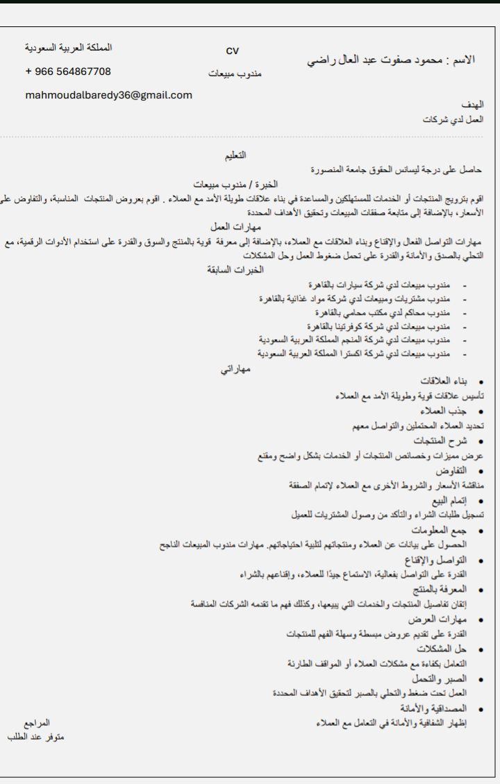 أنا محمود صفوت. مصري. مقيم في المملكة العربية السعودية. مدينة جدة. ابحث عن عمل مندوب مبيعات خبرة أكثر من أربع سنوات. وسبق لي العمل مندوب مبيعات في شركة المنجم بالمملكة العربية السعودية. وسبق لي العمل مندوب مبيعات في شركة اكسترا بالمملكة. وسبق لي العمل مندوب مبيعات مواد غذائية في شركة كوفرتينا في القاهرة. وسبق لي العمل مندوب محاكم لدي مكتب محاماة في القاهرة. إقامة سارية. رخصة قيادة سارية. السن 26 س