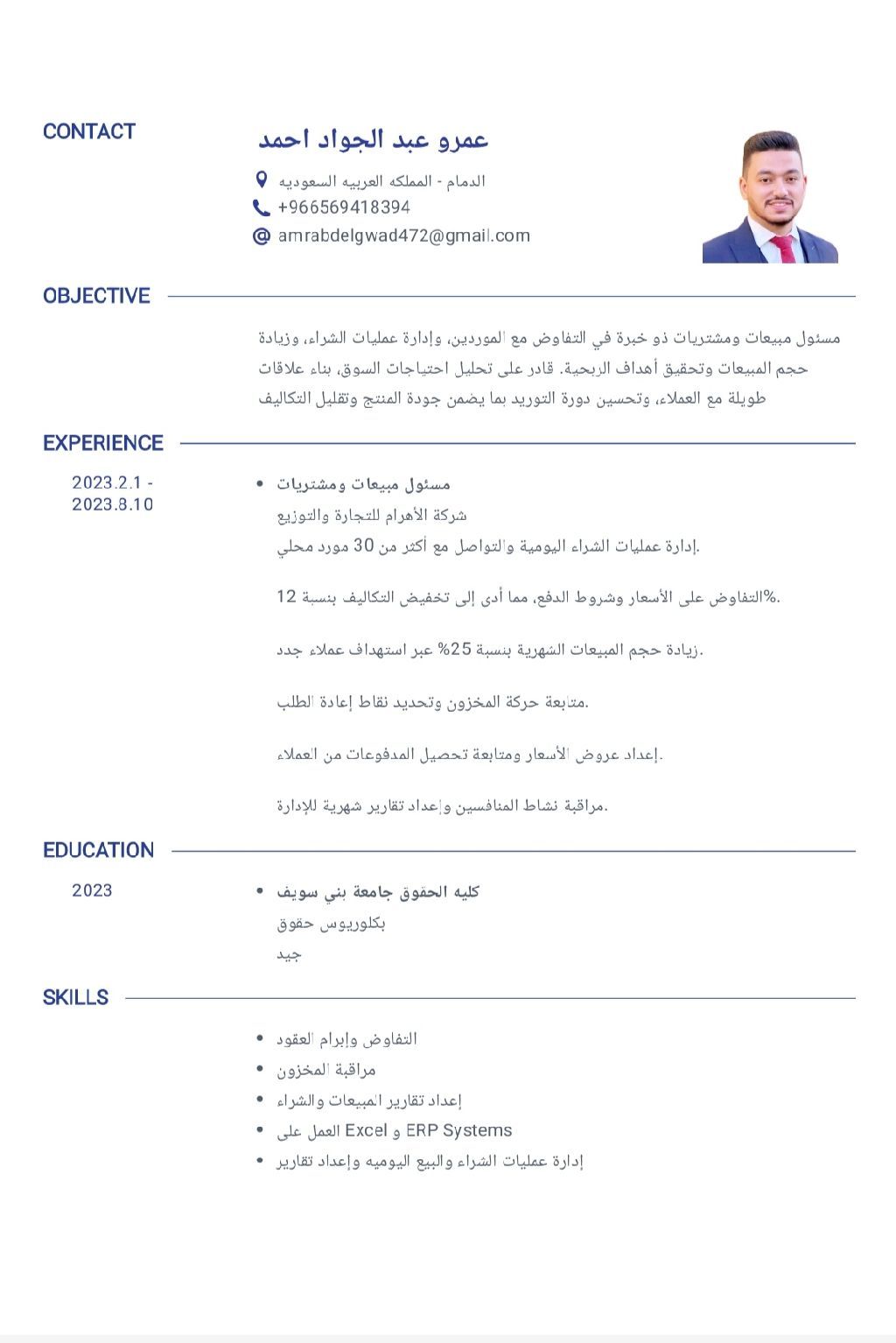 عمرو عبد الجواد متخصص تسويق ومبيعات ومشتريات بخبرة في إدارة عمليات البيع والتفاوض مع العملاء، وتحقيق المستهدفات، ومتابعة دورة المشتريات من اختيار الموردين لحد استلام المنتجات. بقدر اشتغل تحت ضغط، وأتعامل مع العملاء بشكل محترف، وعندي مهارة قوية في التواصل وتحليل احتياجات السوق. خبرة في التسويق الميداني والرقمي إدارة المبيعات وتحقيق الأهداف التفاوض وأقفال الصفقات إدارة المشتريات