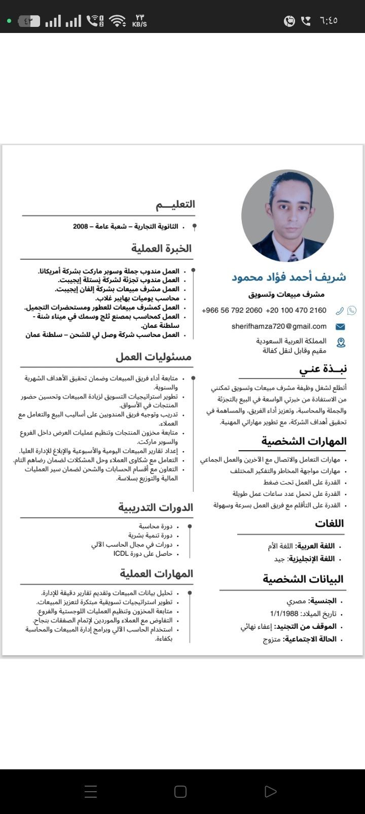 محاسب ومشرف مبيعات وتسويق يوجد إقامة