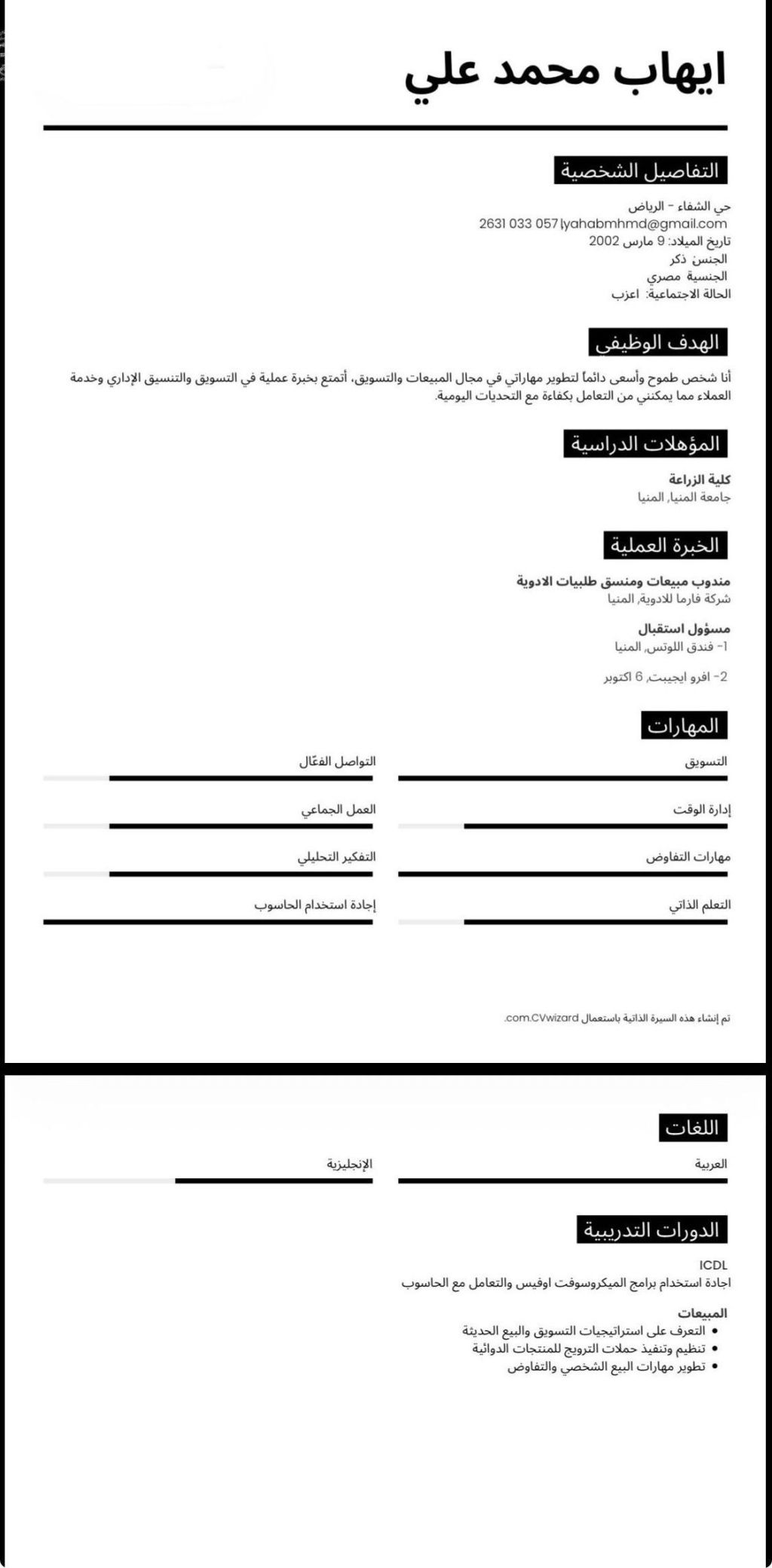 ابحث عن عمل - أنا متخصص في مجال المبيعات والتسويق مع خبرة في تطوير استراتيجيات مبيعات فعالة وتحقيق الأهداف. امتلك مهارات قوية في التواصل والتفاوض، وقادر على بناء علاقات قوية مع العملاء. اعمل على فهم احتياجات العملاء وتقديم حلول تتناسب معهم. تطوير استراتيجيات مبيعات فعالة - بناء علاقات قوية مع العملاء - التواصل الفعال مع العملاء - تحليل أداء المبيعات وتحسينه - العمل في بيئات مختلفة - العمل تحت ضغط