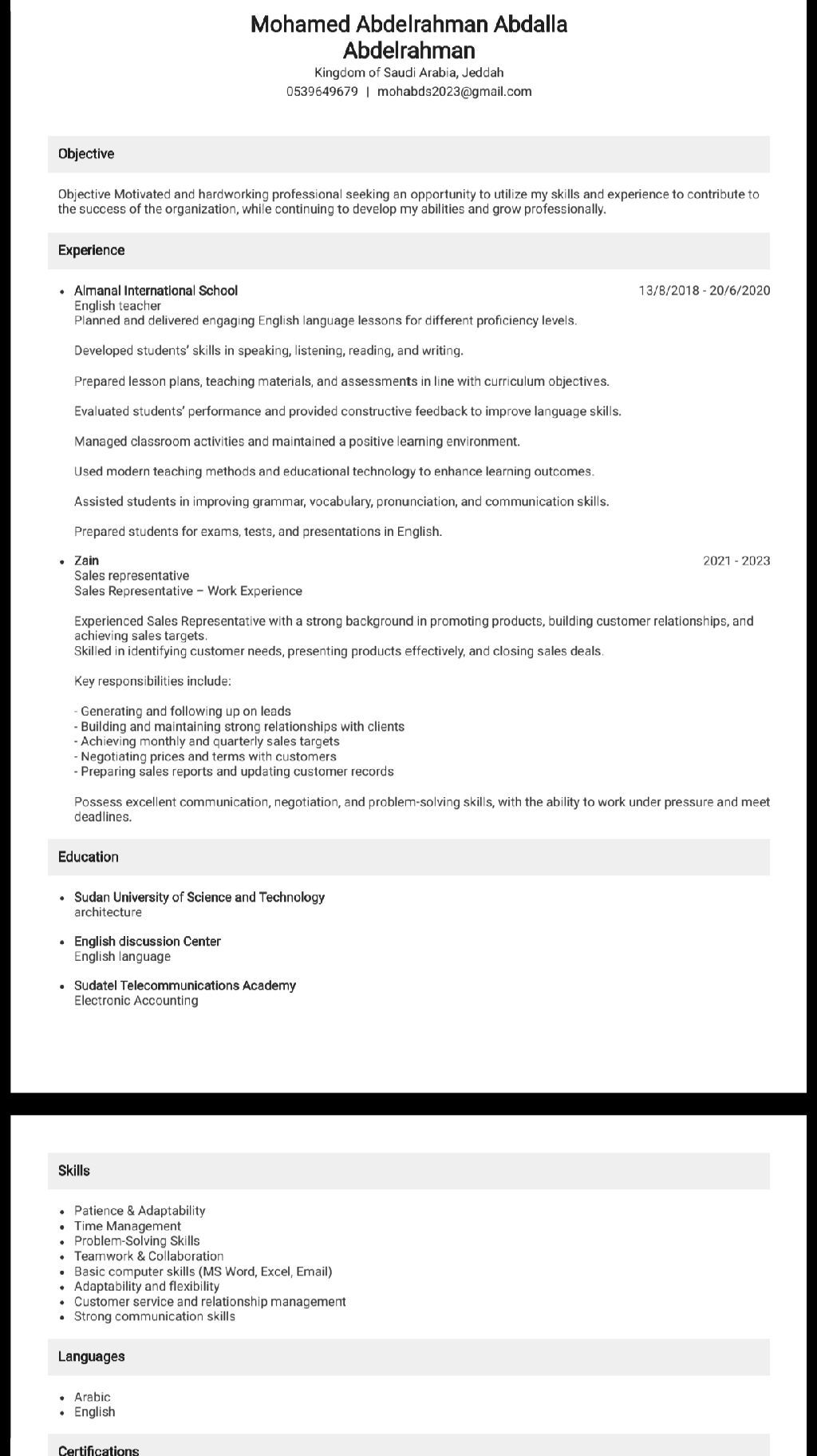 Announcement I am an experienced Sales Representative, currently residing in the Kingdom, and available for sponsorship transfer. I have strong skills in sales, customer relationship management, negotiation, and achieving sales targets, with the ability to work under pressure. Available to start work immediately and ready to join a suitable organization. For more information, please contact