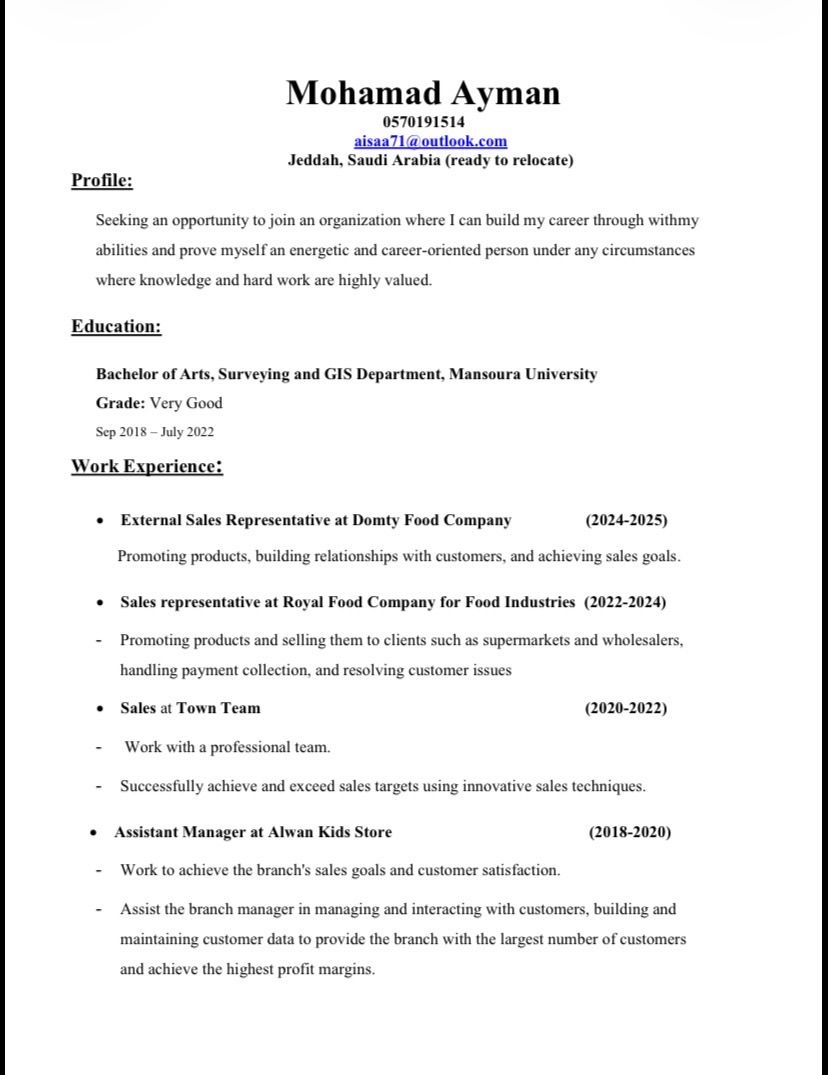 ابحث عن عمل في مجال المبيعات لدي خبرة سابقة في شركات المواد الغذائية في مصر مثل شركة دوم تي وشركة رويال فود ولدي خبرة في مجال الملابس في شركة تاون تيم متاح للعمل فورا في أي مكان داخل المملكة موجود حاليا في جدة رقم التواصل
