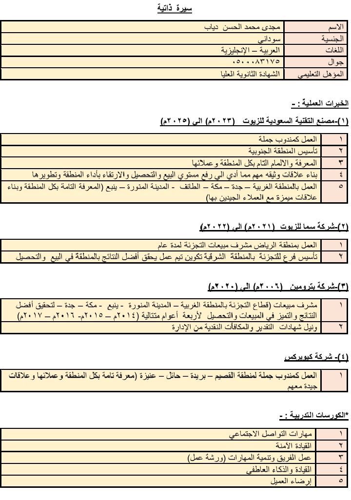 مشرف مبيعات. سوداني. خبرة أكثر من 10 سنوات في مجال مبيعات الزيوت. معرفة بجذب العملاء الجدد وتحقيق أهداف البيع والتحصيل وعمل كنترول على المديونيات وتحصيلها خاصة المتأخرات منها واحتواء وتشجيع الفريق بتطوير نقاط القوة فيه وتنمية مهاراته البيعية