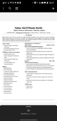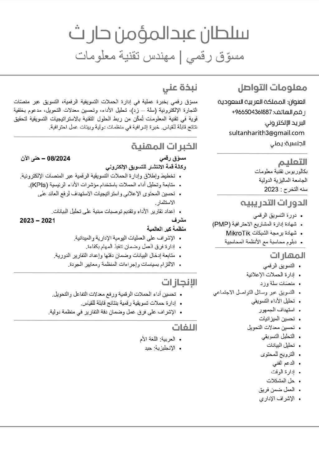 متخصص في تقنية المعلومات والتسويق الالكتروني لدي الخبرة في اطلاق وادارة الحملات الاعلانية الممولة لمدة سنة في وكالة قمة الانتشار للتسويق الالكتروني، مع فهم تقني يساعد في تحسين الأداء وتحقيق أفضل النتائج