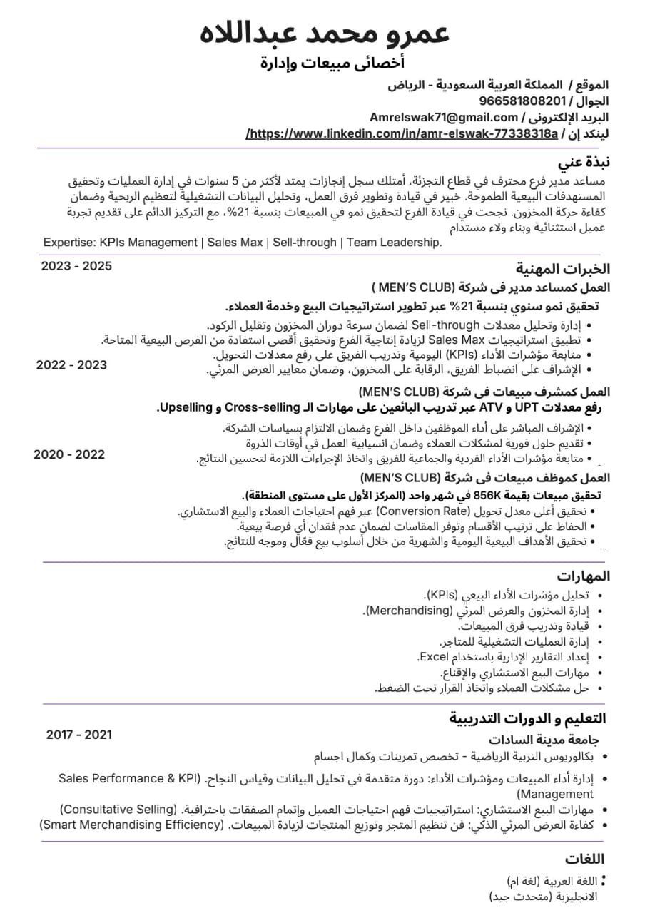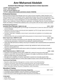 Experienced Retail Assistant Store Manager. 5 + years expertise. Driven 21% sales growth and reached 856000 EGP record sales. Expert in KPI Analysis, 25% Conversion Rate, and Inventory Control. Strong skills in team leadership and consultative selling. Located in Saudi Arabia, ready to relocate and join immediately