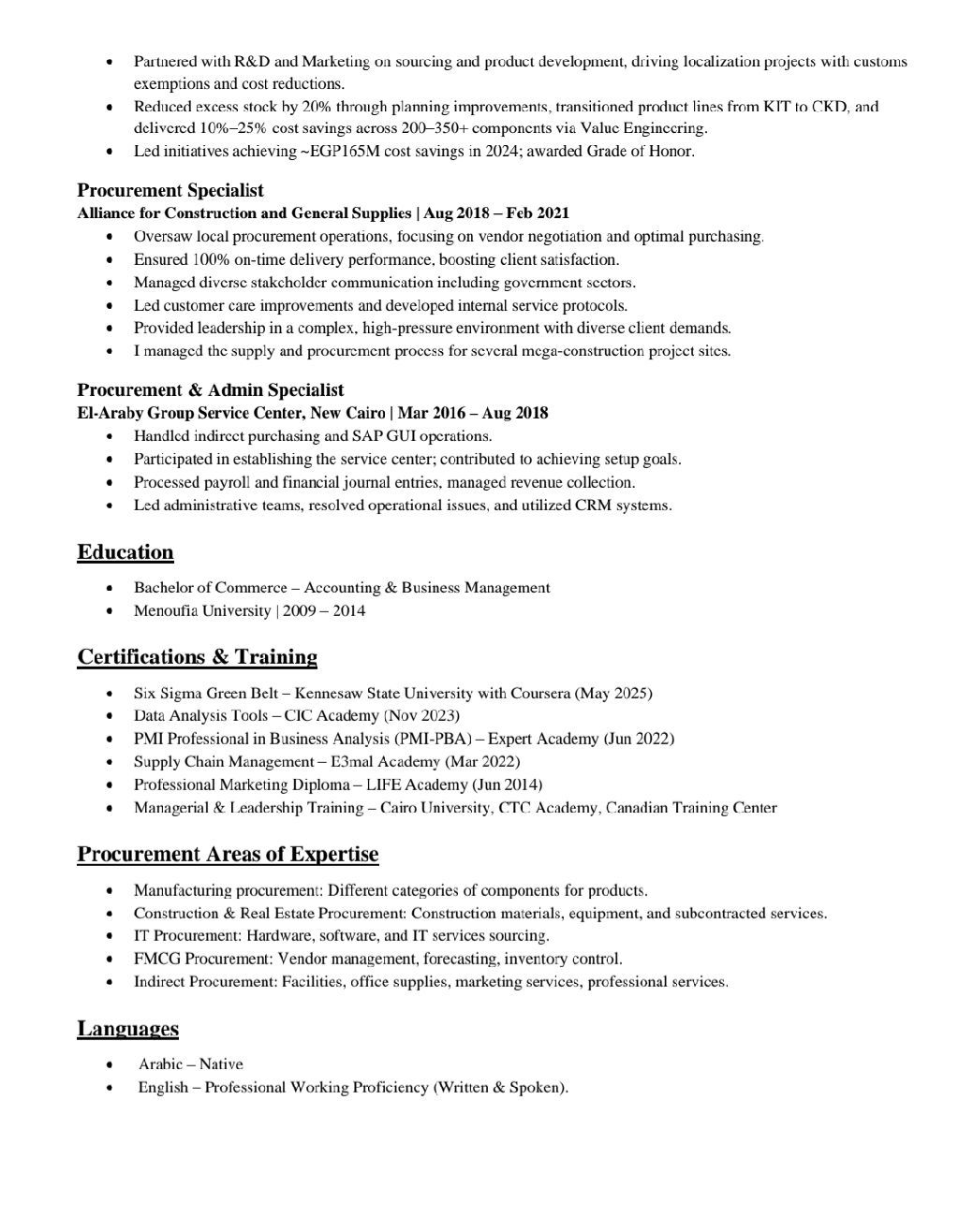 Seeking a position as Senior Procurement Specialist. Over 8 years of experience in procurement and supply chain, including local and international purchasing, supplier management, negotiations, contracts, and cost reduction. Strong hands - on experience with SAP S 4 HANA and Power BI, delivering improvement and Value Engineering initiatives that enhanced purchasing cycle efficiency