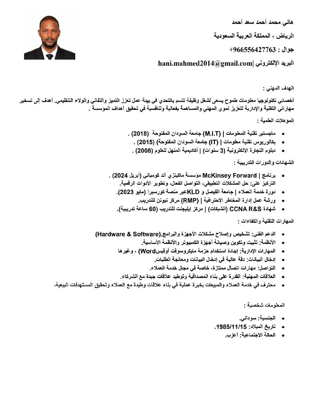 سوداني الجنسية، حاصل على بكالوريوس في تقنية المعلومات وامتلك رخصة قيادة سارية وإقامة قابلة للنقل. ابحث عن فرصة عمل في مجال الحاسب الآلي أو المبيعات. أتمتع بالانضباط والقدرة على التعامل مع العملاء بمرونة عالية. جاهز للعمل فورا