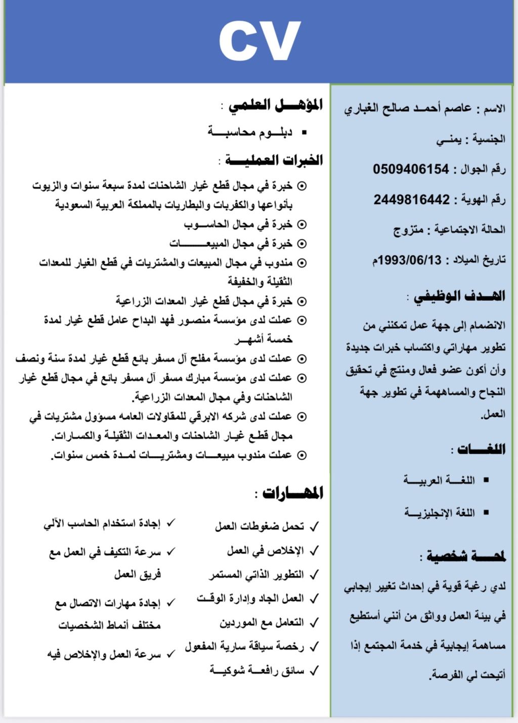 أنا يمني الجنسية. ابحث عن عمل مندوب مبيعات أو مشتريات. في مجال قطع غيار التريلات والمعدات الثقيله والكسارات خبرة في مجال القطع سبع سنوات