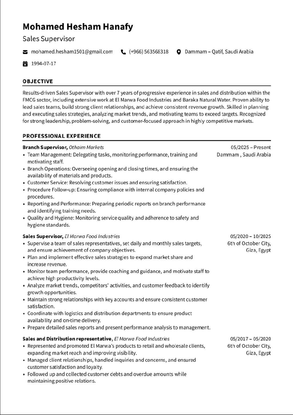 Sales Supervisor with over 8 years of experience in managing and developing sales operations. Worked with leading companies such as El Marwa Food Industries and Baraka Natural Water. Proven ability to lead sales teams, achieve and exceed targets, expand customer base, and drive sustainable revenue growth. Based in Saudi Arabia and seeking a growth - focused sales opportunity