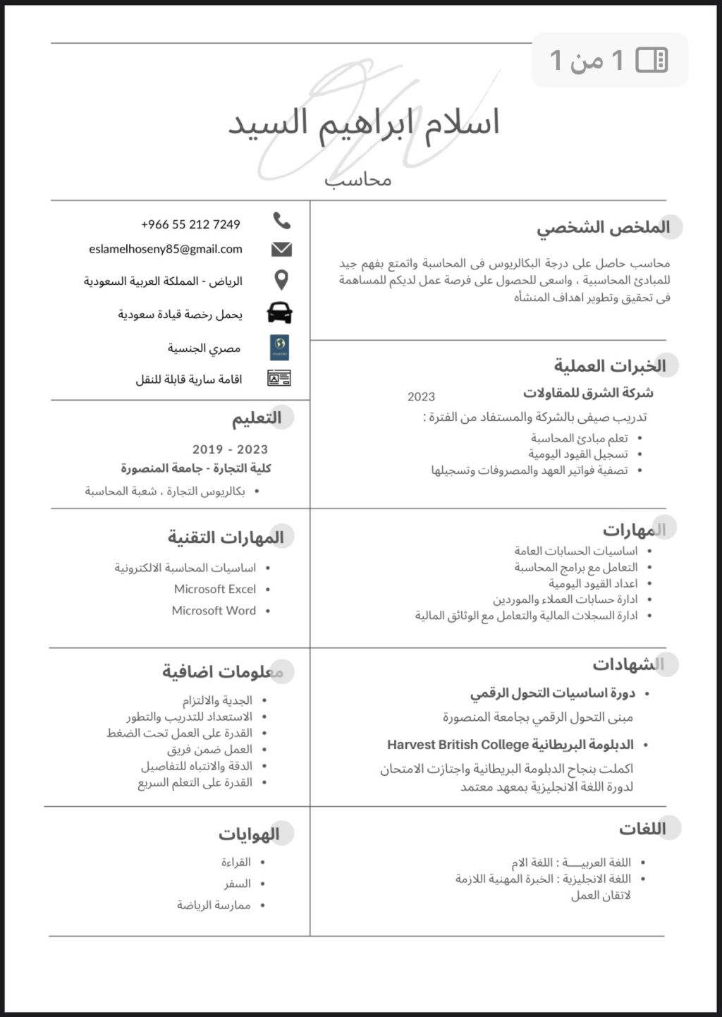 محاسب حاصل على درجة البكالوريوس في المحاسبة وأتمتع بفهم جيد للم بأدى المحاسبية