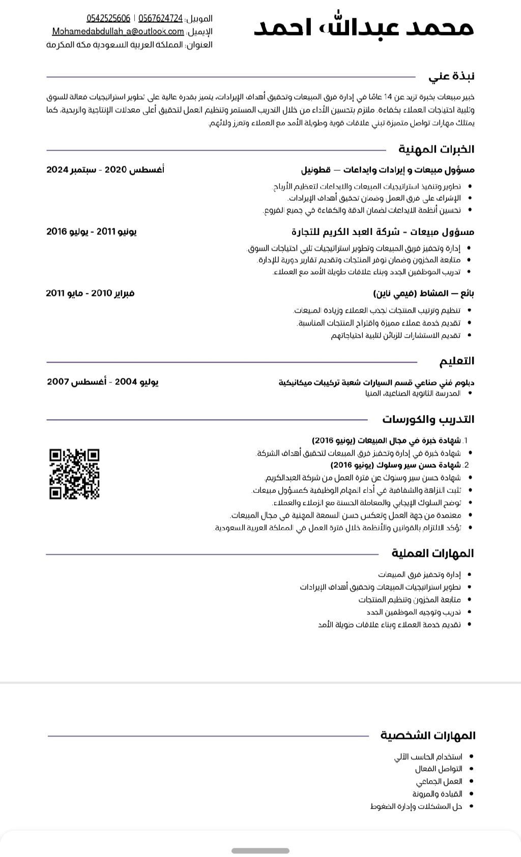 خبرة في مجال المبيعات والعرض البصري داخل المحلات خبرة في تنسيق المنتجات وعرضها لجذب العملاء أكثر من 10 سنوات حاصل على بعض شهادات الخبرة وحسن سير وسلوك حاصل على دورات في الحاسب الآلي استخدام برامج مايكروسوفت أوفيس