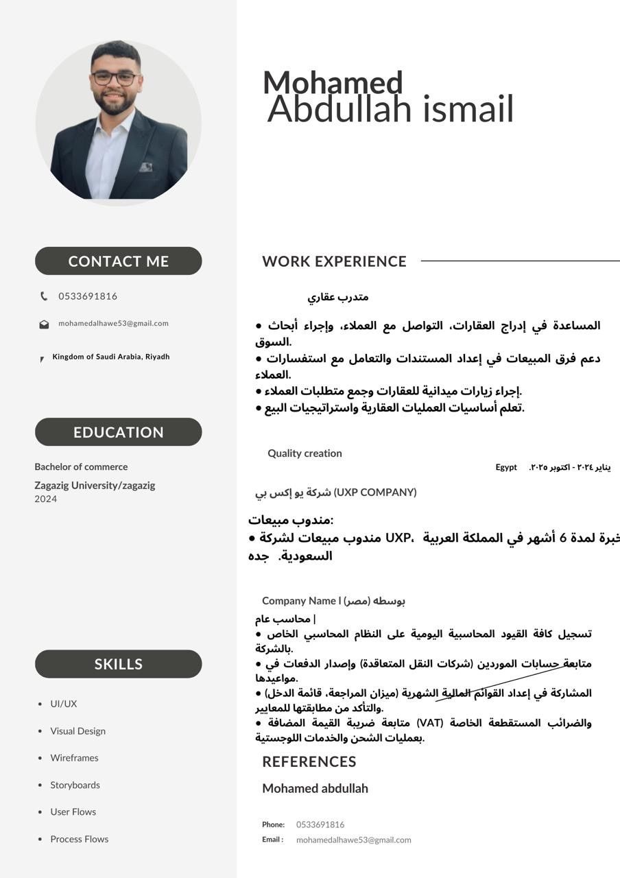 حاصل على بكالوريوس تجارة - شعبة محاسبة. لدي خبرة 6 أشهر في مجال المبيعات بمدينة الرياض في مجال أفلام الحماية للسيارات. ابحث عن فرصة عمل كمندوب مبيعات أو في مجال المبيعات بشكل عام داخل بيئة عمل مستقرة ومحفزة على التطور. أتميز بالالتزام، حسن التعامل مع العملاء، والقدرة على تحقيق أهداف البيع. متواجد في الرياض وجاهز للعمل فورا